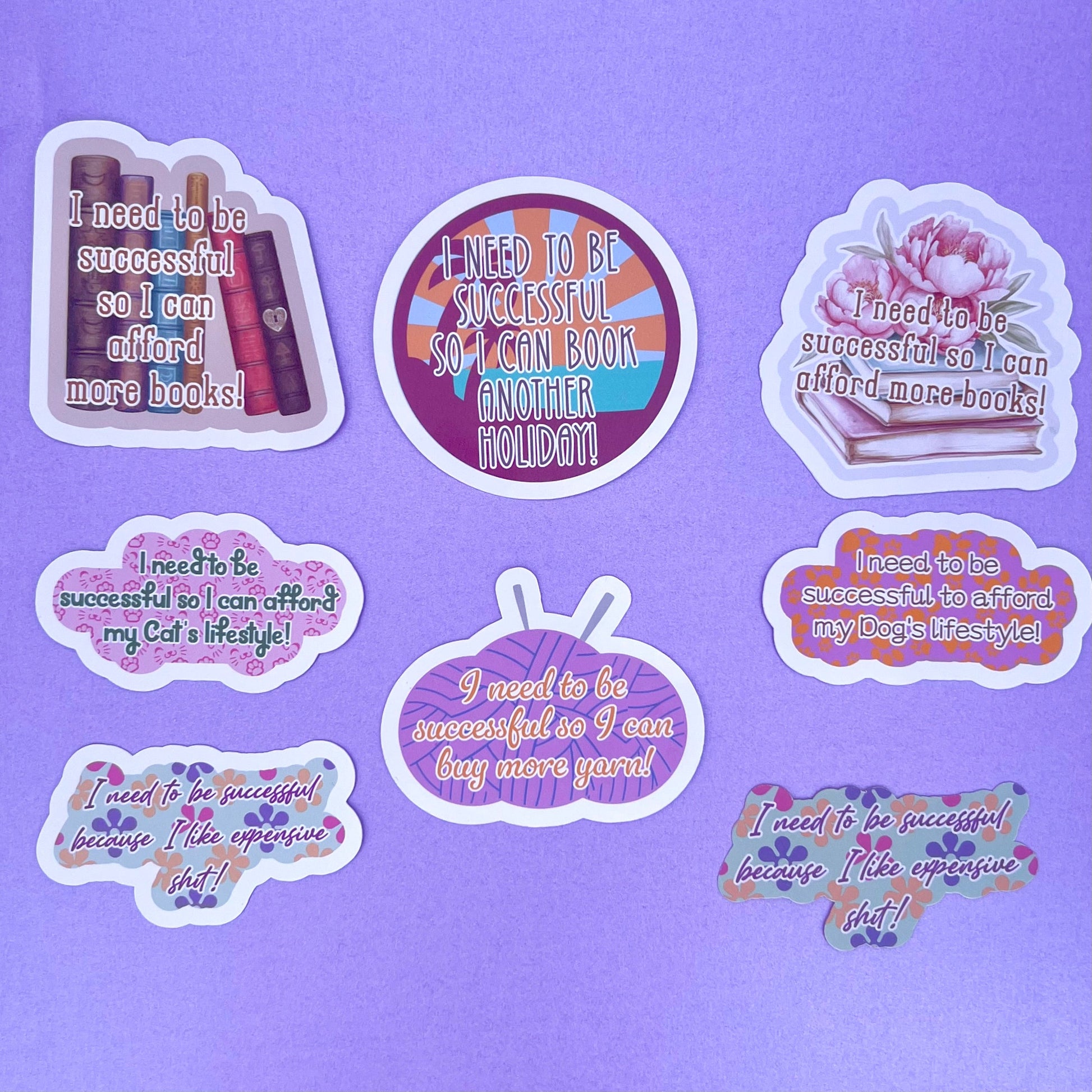 💸 I Need to Be Successful... Sticker Set Motivational with a wink, these stickers are perfect for goal-setters who know exactly what they’re working for—whether it’s yarn, books, or their pet’s lavish lifestyle.